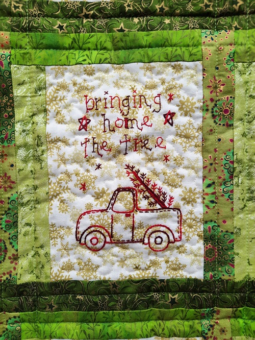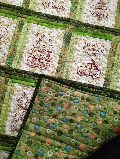 I used a mix of quilting. Straight lines in the sashing and borders. Stippling in the embroidery part of the blocks.