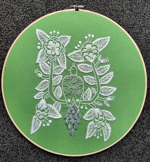 It is quite large and is sitting in a 14in hoop. Most of the stitching is done using six strands of DMC. I found it took me a while to get used to that as I normally work with only one or two threads. But in the end I liked the effect it created.
