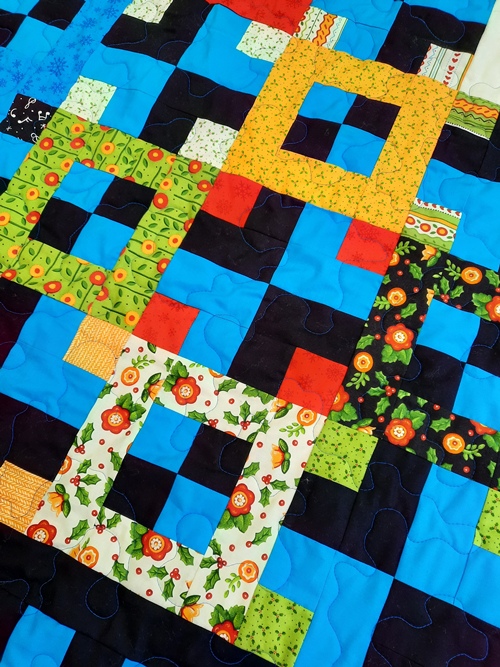 I still have the first one, so this one can be a donation. The interlocking blocks were made using a jelly roll plus some blue yardage. Quilting is a simple meander.