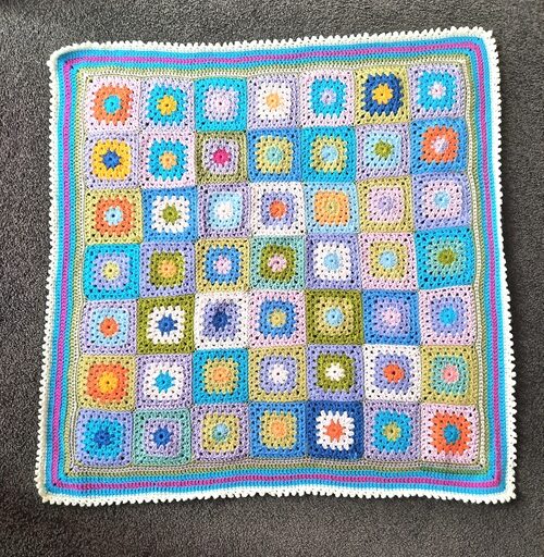 I managed to get enough granny squares crocheted to make a small knee rug. Some colours ran out during rounds, but it is supposed to be scrappy, so I just joined in another color. The yarns are all leftovers from various Attic 24 blankets.